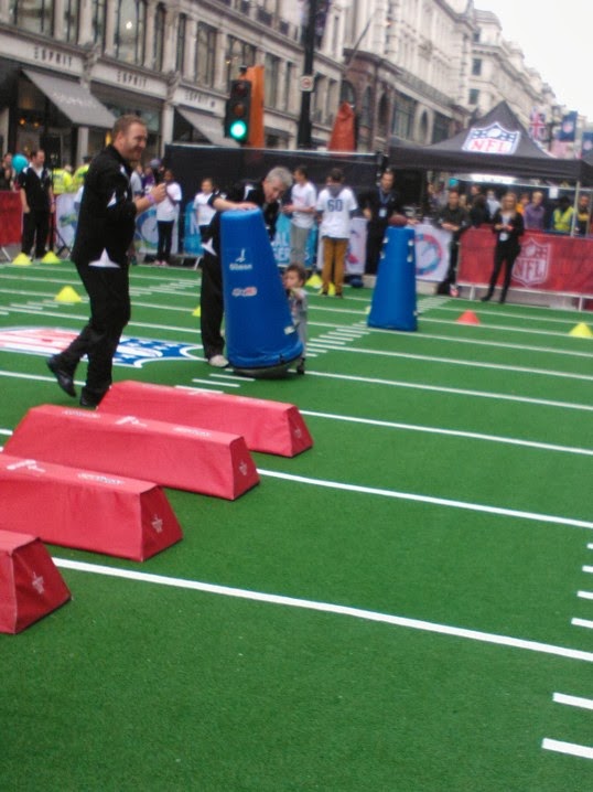 This weekend we were up in London and happened to be wandering past Regent Street and we saw all the inflatables. Nate saw the huge tiger and wanted to go to it. The whole of Regent Street was taken over by NFL, there were several activities to take part in including: a Bouncy Castle and various American football type trials. There were lots and lots of places to eat as well, the queues were very long for the food.